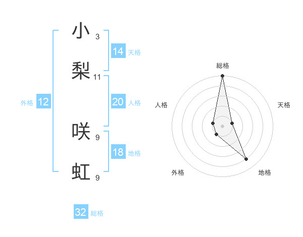 小梨 咲虹さんの総格は32画の5点!