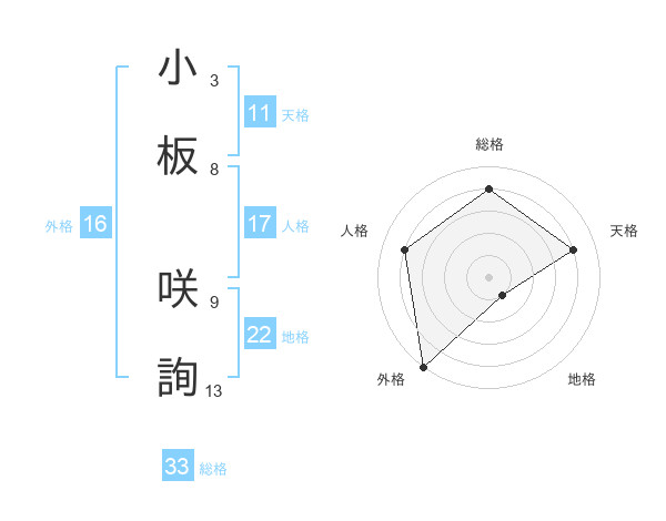 小板 咲詢さんの総格は33画の4点!