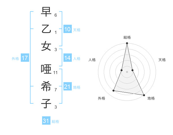 早乙女 唖希子さんを姓名の画数から五運を鑑定