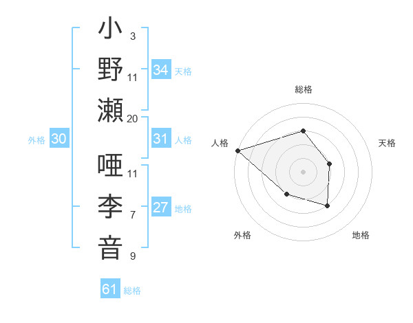 小野瀬 唖李音さんを姓名の画数から五運を鑑定