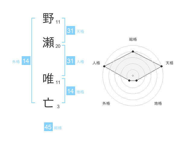 野瀬 唯亡さんの総格は45画の4点!