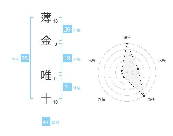 薄金 唯十さんを姓名の画数から五運を鑑定