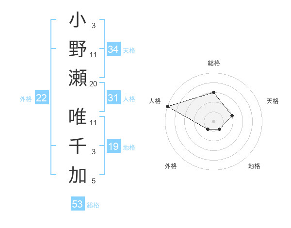 小野瀬 唯千加さんの総格は53画の3点