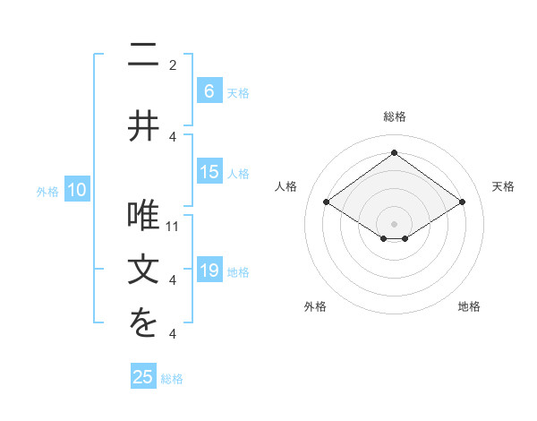 二井 唯文をさんを姓名の画数から五運を鑑定