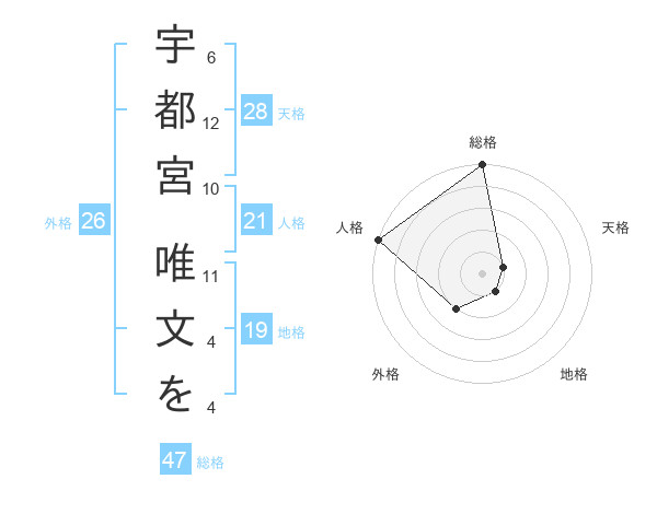 宇都宮 唯文をさんを姓名の画数から五運を鑑定