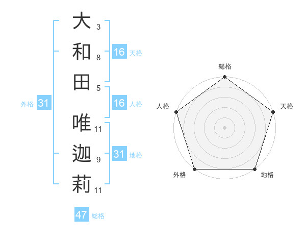 大和田 唯迦莉さんの総格は47画の5点!
