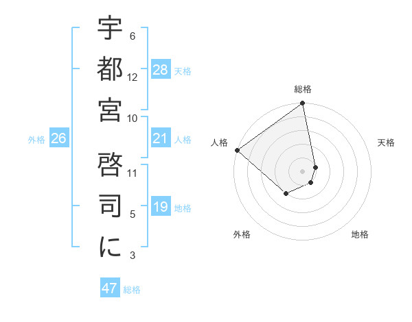 宇都宮 啓司にさんの総格は47画の5点!