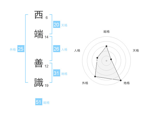 西端 善識さんの総格は51画の3点!