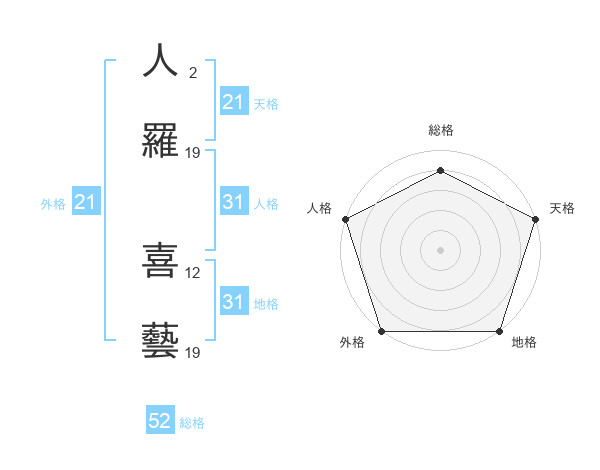 人羅 喜藝さんを姓名の画数から五運を鑑定