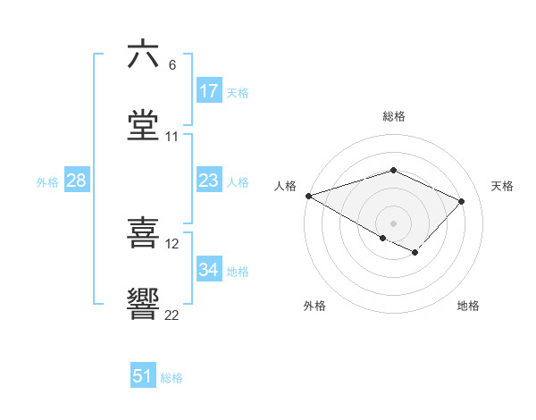 六堂 喜響さんを姓名の画数から五運を鑑定