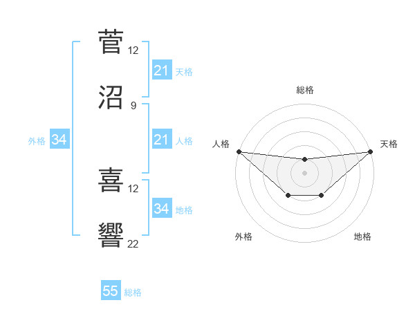 菅沼 喜響さんの天格は21画の5点!