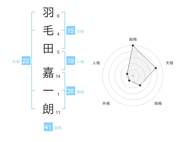 羽毛田 嘉一朗さんの総格は41画の5点!