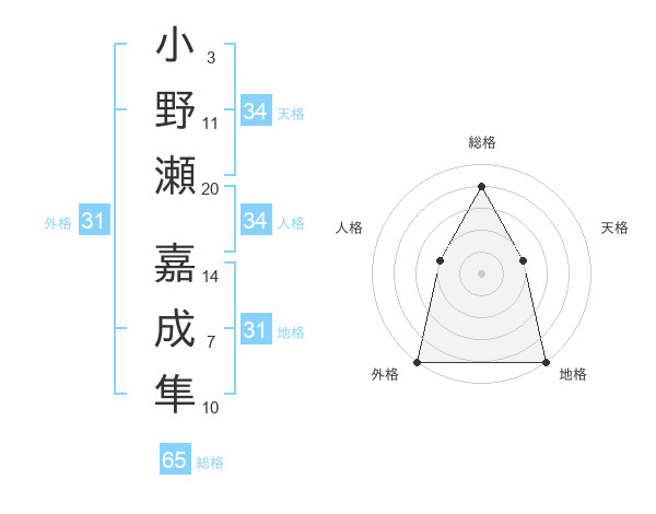 小野瀬 嘉成隼さんの総格は65画の4点!