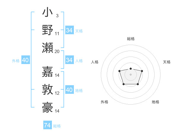 小野瀬 嘉敦豪さんの総格は74画の1点!
