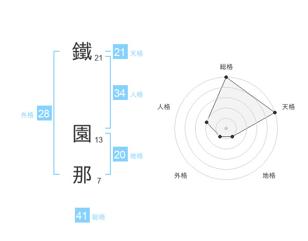 鐵 園那さんの天格は21画の5点!