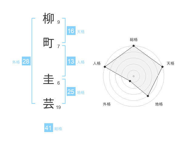 柳町 圭芸さんを姓名の画数から五運を鑑定