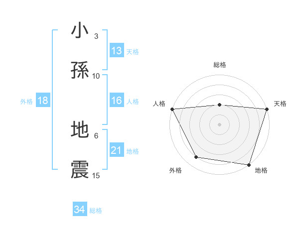 小孫 地震さんの地格は21画の5点!