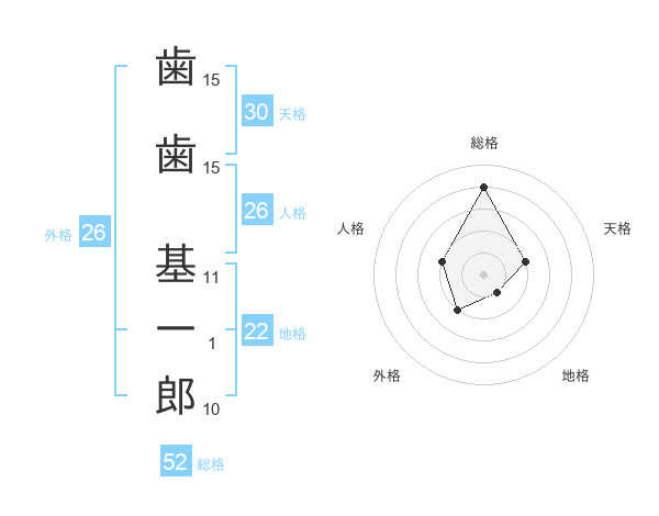 歯歯 基一郎さんの総格は52画の4点!