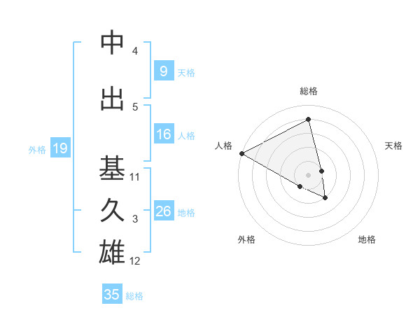 中出 基久雄さんを姓名の画数から五運を鑑定