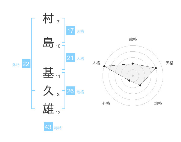 村島 基久雄さんの総格は43画の2点!