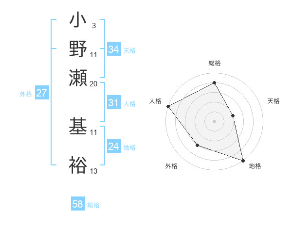 小野瀬 基裕さんの総格は58画の4点!