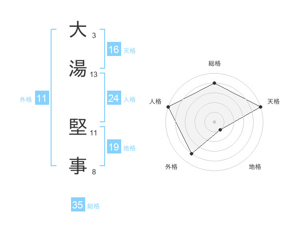 大湯 堅事さんを姓名の画数から五運を鑑定
