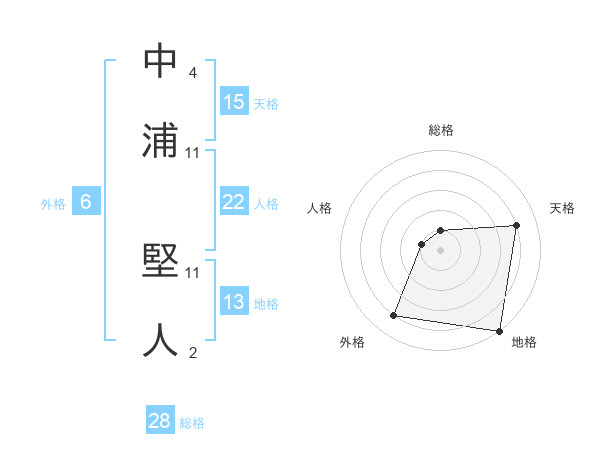 中浦 堅人さんを姓名の画数から五運を鑑定