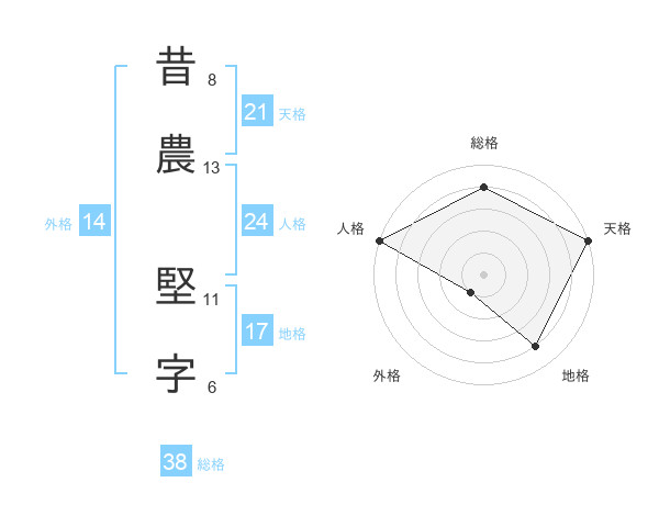 昔農 堅字さんの総格は38画の4点!