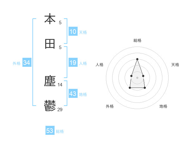 本田 塵鬱さんの総格は53画の3点!
