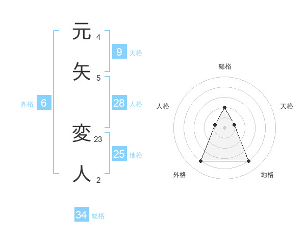 元矢 変人さんの総格は34画の2点!