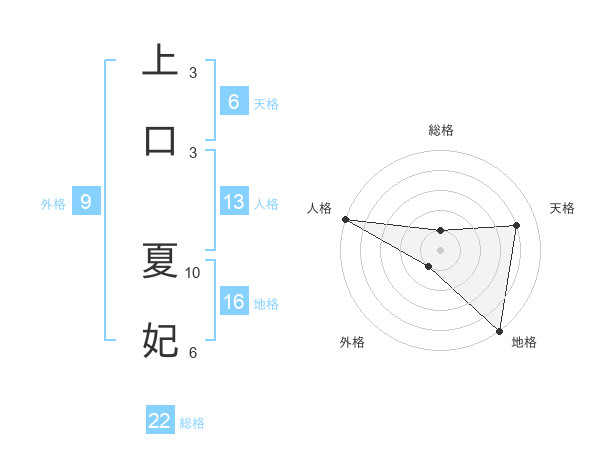 上口 夏妃さんの総格は22画の1点!