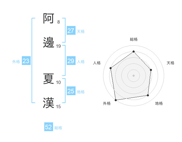 阿邊 夏漢さんを姓名の画数から五運を鑑定