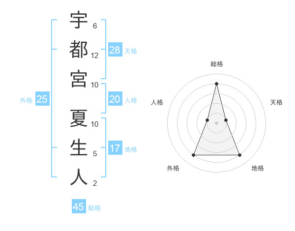 宇都宮 夏生人さんの総格は45画の4点!