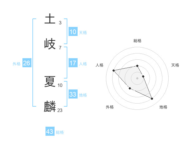 土岐 夏麟さんの総格は43画の2点!