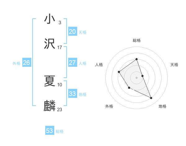 小沢 夏麟さんの天格は20画の1点!