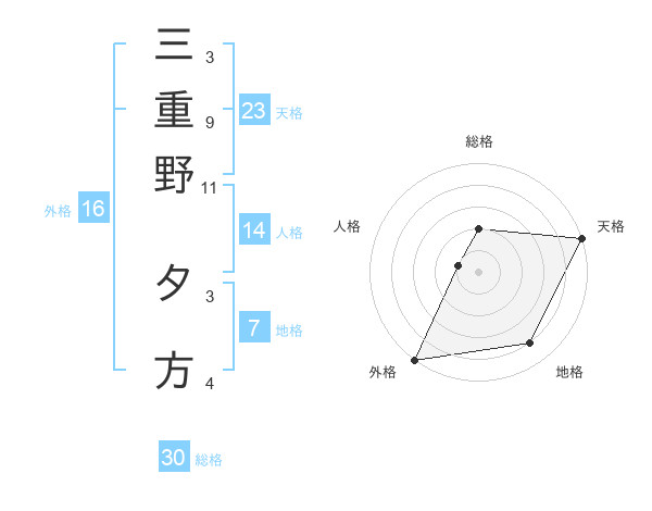 三重野 夕方さんの外格は16画の5点!