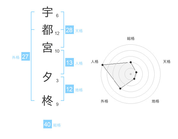 宇都宮 夕柊さんの総格は40画の2点!