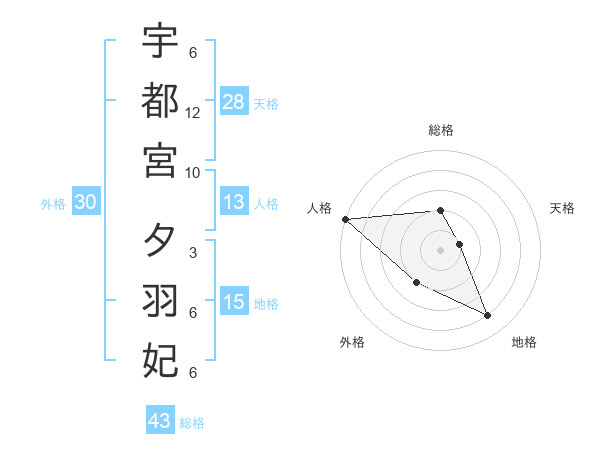 宇都宮 夕羽妃さんの総格は43画の2点!