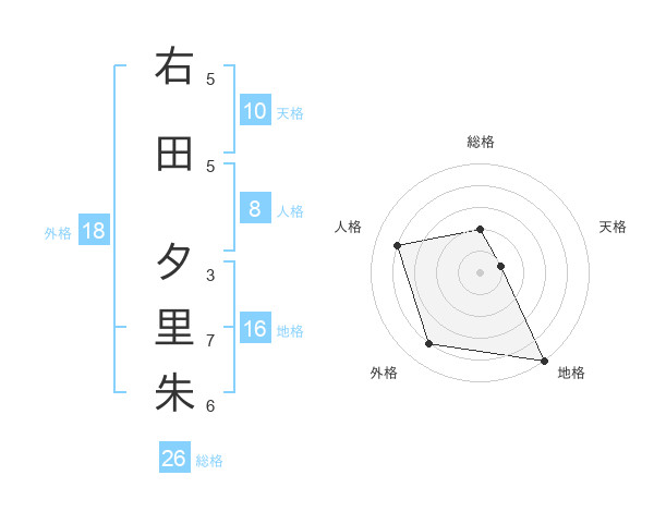 右田 夕里朱さんを姓名の画数から五運を鑑定