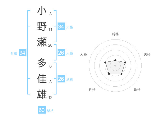 小野瀬 多佳雄さんを姓名の画数から五運を鑑定