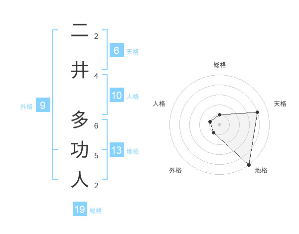 二井 多功人さんの地格は13画の5点!