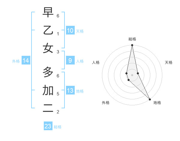 早乙女 多加二さんの総格は23画の5点!