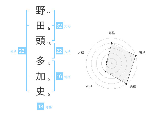 野田頭 多加史さんを姓名の画数から五運を鑑定