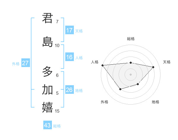 君島 多加嬉さんの総格は43画の2点!
