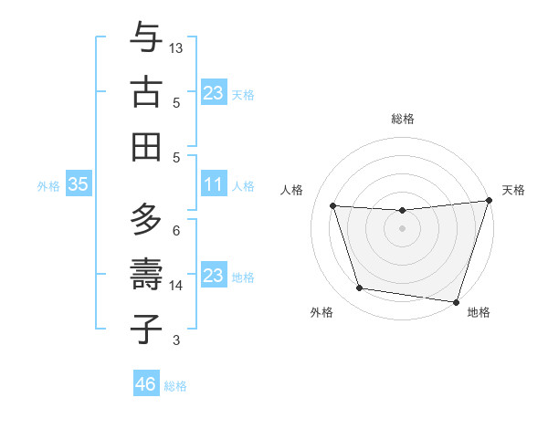 与古田 多壽子さんを姓名の画数から五運を鑑定