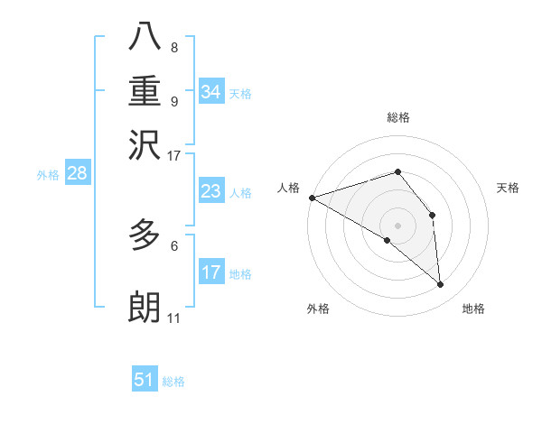 八重沢 多朗さんの総格は51画の3点!