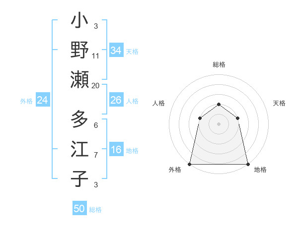 小野瀬 多江子さんを姓名の画数から五運を鑑定