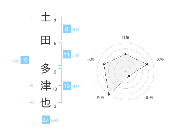 土田 多津也さんの総格は27画の3点