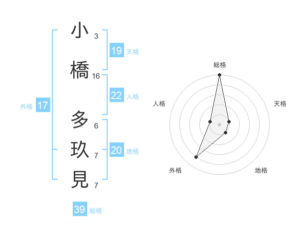 小橋 多玖見さんを姓名の画数から五運を鑑定