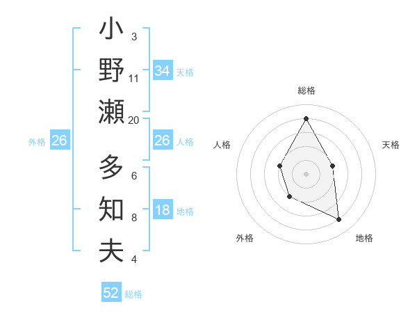 小野瀬 多知夫さんの総格は52画の4点!